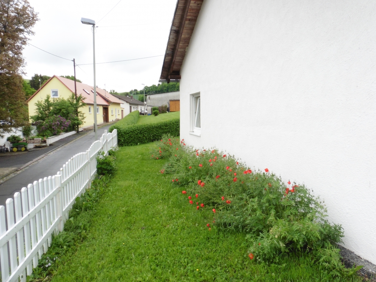 - Achter de woning is een ruim terras voorzien, ingericht met tuinmeubilair met kussens en parasol.